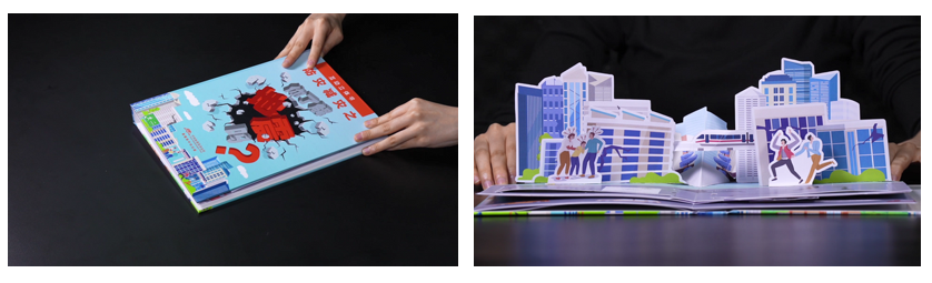 選擇以災害風險中與百姓最為貼近的地震災害作為切入口,通過采用近些年成為科普新風尚的“互動立體書”的方式,擇取學校、社區(qū)、醫(yī)院等常見人員密集場所進行場景機關設計,對地震知識、地震避險知識、地震標準等相關內容進行拆解重組展示介紹。“動手閱讀”的立體書,將枯燥的科普知識轉變?yōu)橐龑教剿鳎x予了閱讀趣味性,有效觸發(fā)目標受眾好奇心與閱讀探索欲。