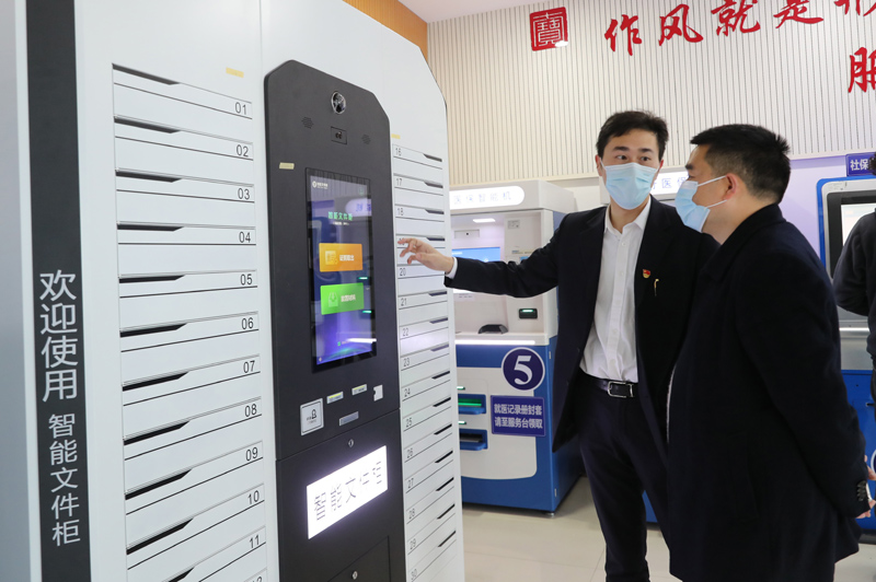 上海市閔行區(qū)七寶鎮(zhèn)社區(qū)事務(wù)受理服務(wù)中心的工作人員(左)向前來辦事的居民介紹智能文件柜的使用方法(2021年3月3日攝)。新華社記者 方喆 攝