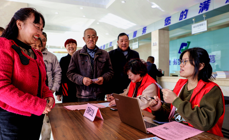 河北省邢臺市襄都區(qū)宴家屯鎮(zhèn)綜合服務(wù)中心工作人員協(xié)助辦事群眾填寫相關(guān)表格(2022年3月30日攝)。新華社發(fā)(張馳 攝)