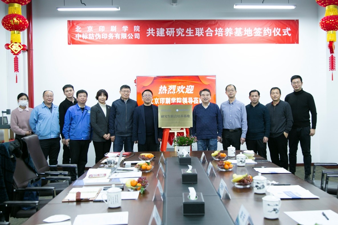 2023年1月11日,北京印刷學院王關義副校長一行六人、中標集團總經(jīng)理王賡赴中標防偽參加“北京印刷學院與中標防偽共建研究生聯(lián)合培養(yǎng)基地”簽約及揭牌儀式,北京印刷學院特別聘請劉祥、李艷君擔任北印研究生校外導師。